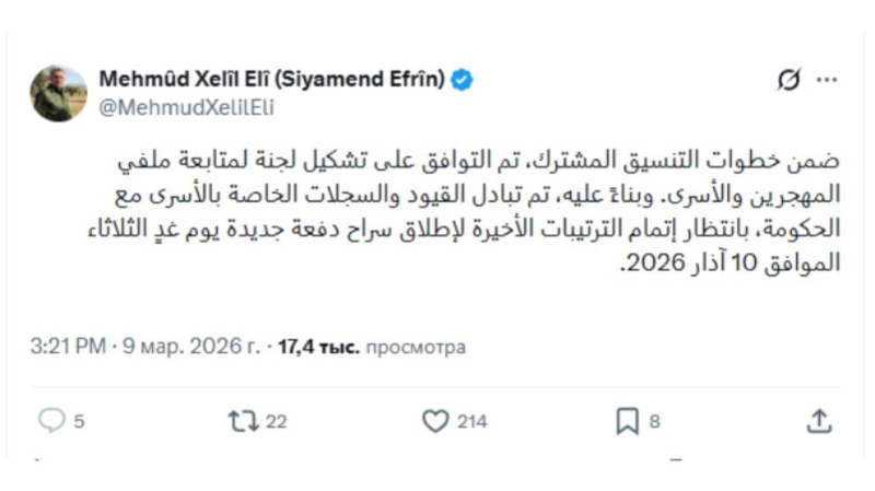 «В рамках шагов совместной координации была достигнута договорённость о создании комитета, который будет следить за делами насильно перемещённых и военнопленных. Соответственно, записи и документы, касающиеся пленных, были переданы временному правительству, и ожидается завершение последних процедур для освобождения другой группы завтра (10 марта 2026 года)».